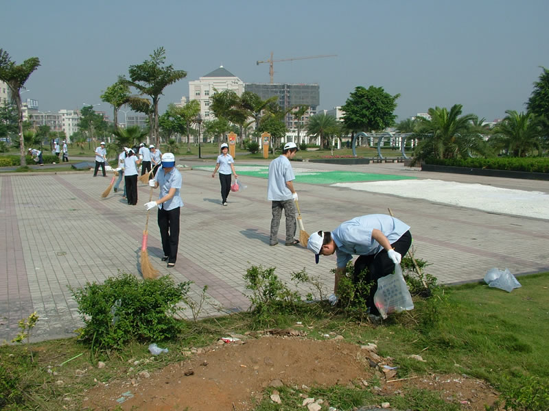 广场上绿荫如盖、绿草如茵,是居民们煅炼、休闲的好去处。但也正因为游人如织,草地上、灌木丛中,塑料袋、塑料杯、矿泉水瓶、西瓜皮、卫生纸等无处不在。耀世娱乐集团的青年志愿者们张挂好宣传条幅,顶着仲夏的烈日,汗流浃背地拾拣垃圾。尤其这些平时打扮得清清爽爽、喜爱干净的女孩们,此刻却连已经腐败的西瓜皮也敢于直面,毫不手软。